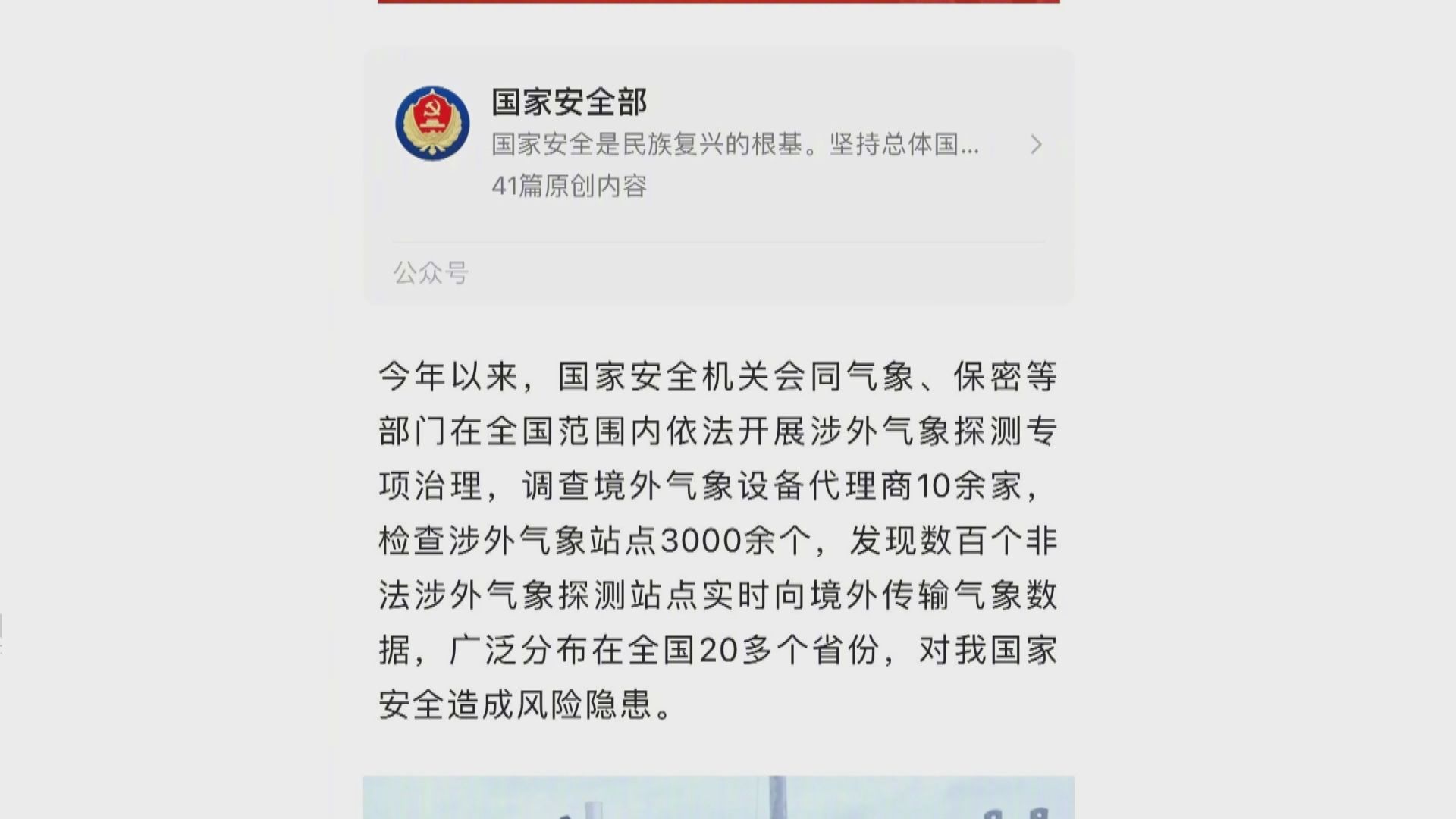 國安部:數百個非法氣象探測站實時向境外傳輸數據 國安部:數百個非法氣象探測站實時向境外傳輸數據 2023年10月31日 09:30 【Now新聞台】內地發現數百個受外國政府資助的非法氣象探測站點,分布全國廣泛地區。 國家安全部指,今年以來,國家安全機關同氣象保密等部門檢查全國超過3000個涉外氣象站點,發現有數百個是非法,部分探測項目受境外政府直接資助,部分設在軍事單位及軍工企業等敏感場所周邊作GPS定位,部分設在主要糧食產區分析農作物生長及糧食產量,部分甚至長時間、高頻次及多點位實時傳輸數據至外國官方氣象機構,為外國國土安全及氣象監測服務。 國安部指,這些非法探測站點分布全國20多個省份,對國家安全構成風險。