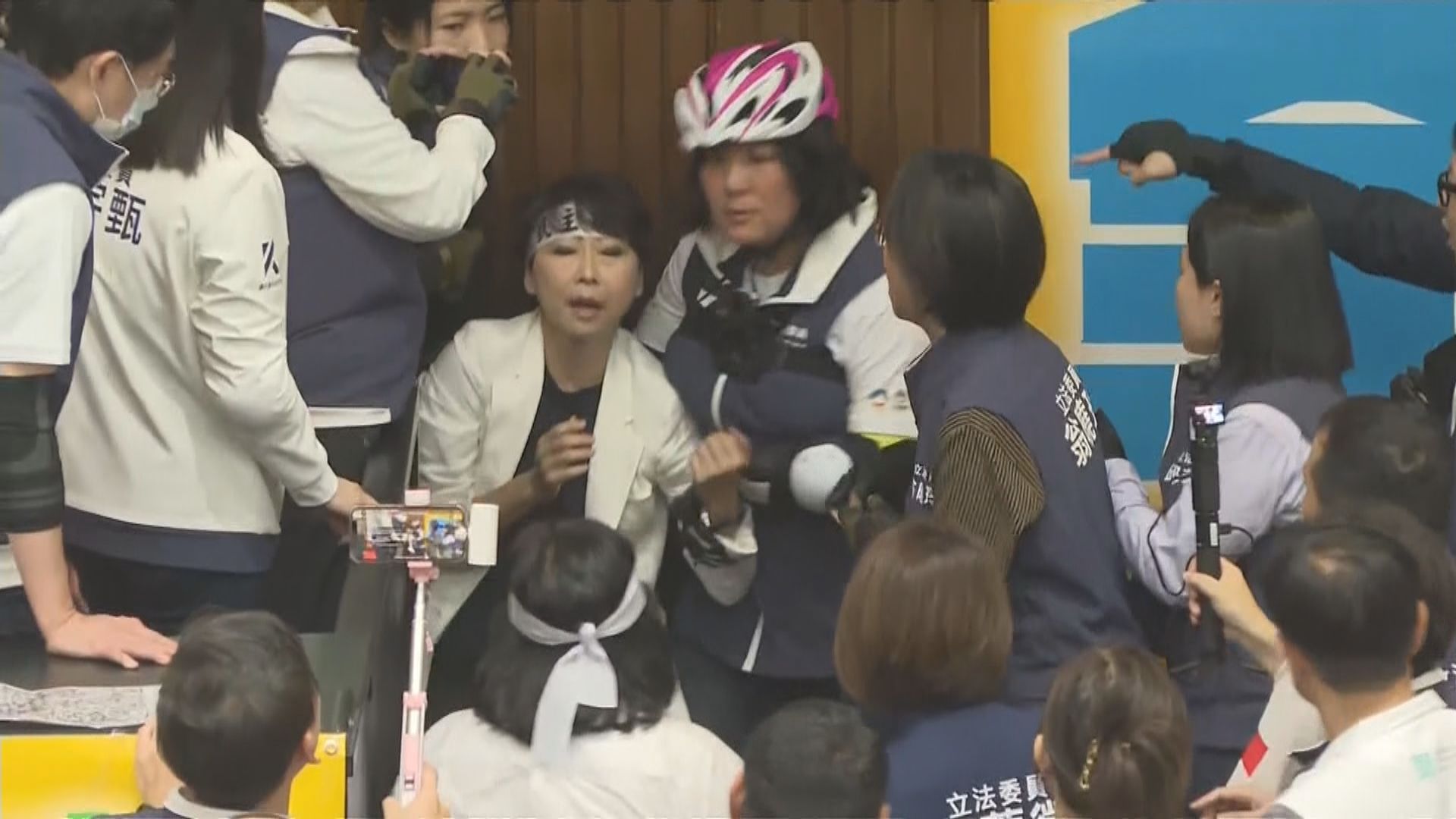 民眾黨立委麥玉珍和民進黨立委林淑芬因掛橫額標語問題動手衝突,要其他立委隔開控制場面,兩人互相指責對方先動手。