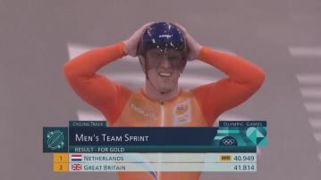 巴黎奧運 場地單車男子團體爭先賽 荷蘭破世界紀錄奪金 巴黎奧運 場地單車男子團體爭先賽 荷蘭破世界紀錄奪金 2024年8月7日 08:13 【Now新聞台】場地單車項目,荷蘭在男子團體爭先賽,破世界紀錄奪金。 東京奧運決賽翻版,橙衫荷蘭對英國三圈的比賽鬥750米,賀蘭特及拿費臣各自領放一圈破風,再由雲達貝治衝圈,平均時速達到65公里,最終做出40秒949,將他們在第一輪創造的世績推前0.242秒。