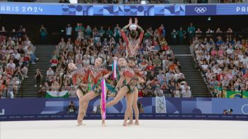 巴黎奧運藝術體操團體全能賽 國家隊奪金 巴黎奧運藝術體操團體全能賽 國家隊奪金 2024年8月10日 22:05 【Now新聞台】巴黎奧運藝術體操團體全能,國家隊奪金。 團體全能一隊5名選手,分為兩個回合,先鬥圈操。評判按照難度及藝術性等4個標準評分,每回合總分40。 國家隊以全場最高、難度分9.5的動作取得36.95分,領先烏克蘭0.4分。 第二回合,是帶操及球操的混合,國家隊表現亦不錯,動作流暢﹑一致性高,得32.85分不及保加利亞,這回合排第二。但總分69.8,亦足以奪得金牌。以色列落後0.95分得銀牌,意大利第三。