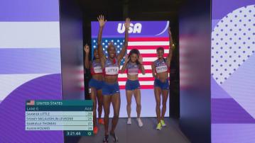 美國的列圖第一棒就快放,然後交到400米欄世界紀錄保持者麥洛連,輕鬆拋離對手擴大優勢,到湯馬絲跑完第三棒,美國已經拉開超過4秒。最後一棒賀姆絲力爭打破蘇聯36年前在漢城奧運創造的世界兼奧運紀錄,衝線一刻,時間定格在3分15秒27,與世績只差十分之一秒,但都贏第二的荷蘭超過4秒半,連續八屆贏得這個項目金牌,銅牌屬於英國。