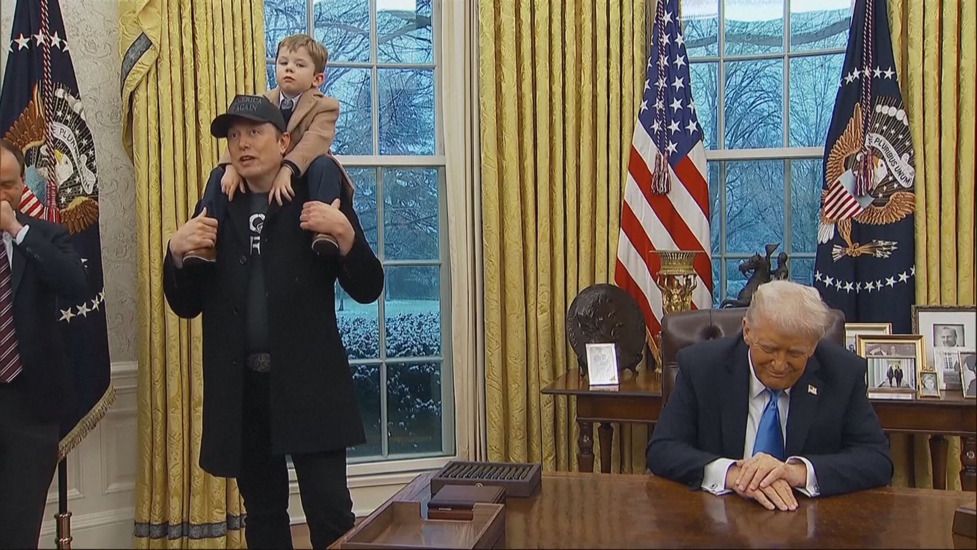 美國總統特朗普,以及領導政府效率部的富豪馬斯克帶同他四歲的兒子,在白宮橢圓形辦公室見記者,是馬斯克加入特朗普政府以來,首次回答記者提問。