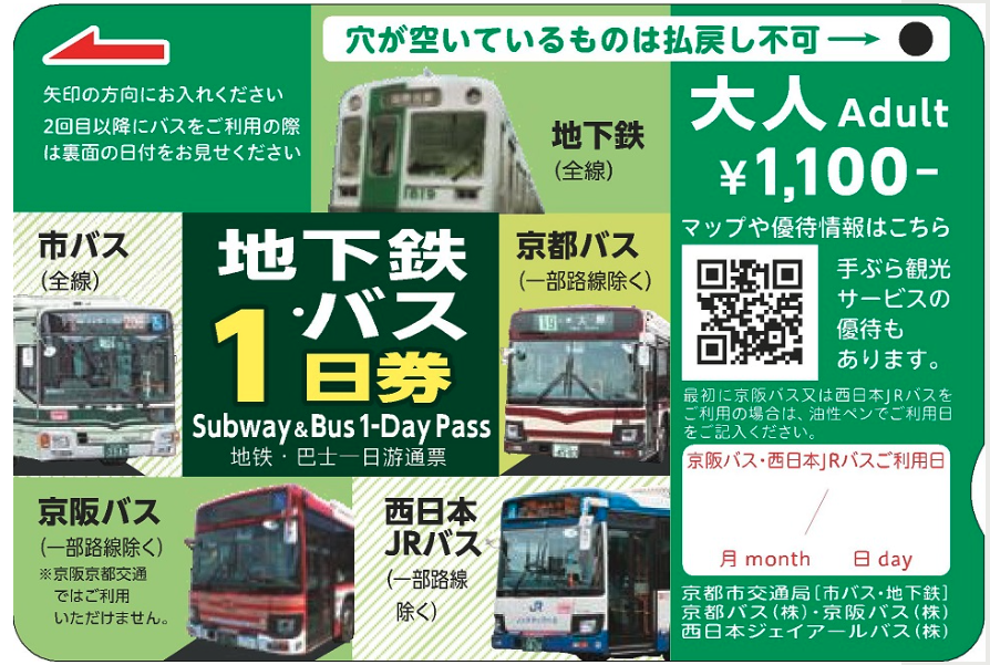 一天內可無限次搭乘市營地下鐵、市營巴士、京都巴士*、京阪巴士*、西日本JR巴士*(*部分路線除外)。成人1,100日圓、小童550日圓。