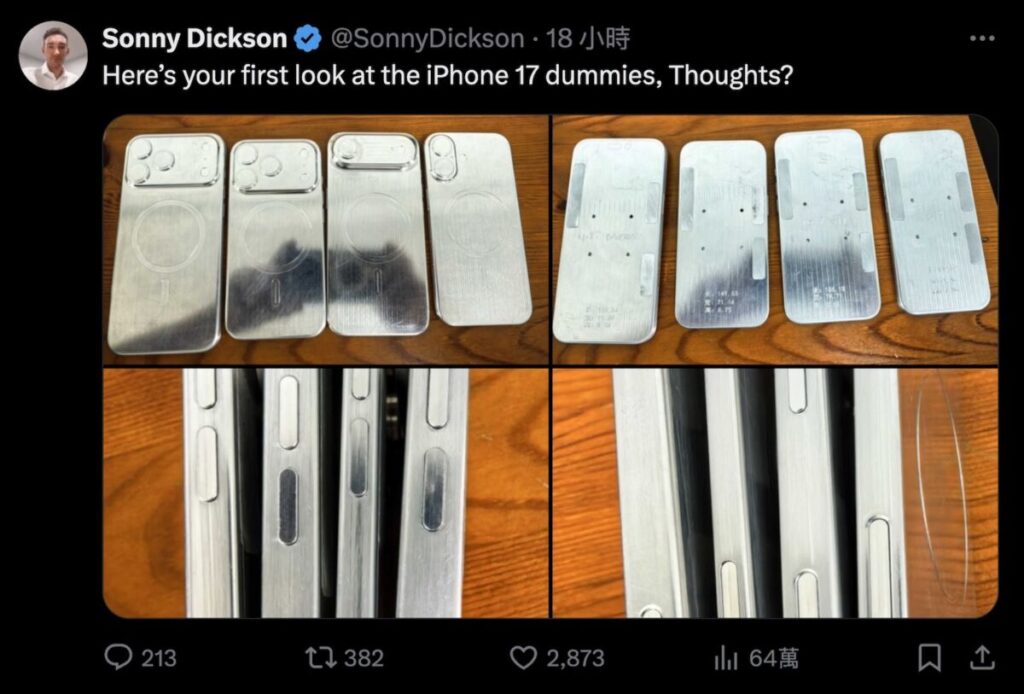 爆料達人 Sonny Dickson 早前在其 X 帳號,展示了疑似 iPhone 17、iPhone 17 Air、iPhone 17 Pro 跟 iPhone 17 Ultra(Pro Max)的機模照片。