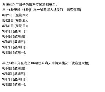 而機場網站亦發布通知,指機場的旅客捷運系統正進行提升工程的測試工作,往來一號客運大樓及T1中場客運廊、海天中轉大樓及一號客運大樓的旅客捷運服務時間將在8月28日至9月8日作臨時調整。機管局提醒旅客預留充足時間登機及辦理出入境手續。