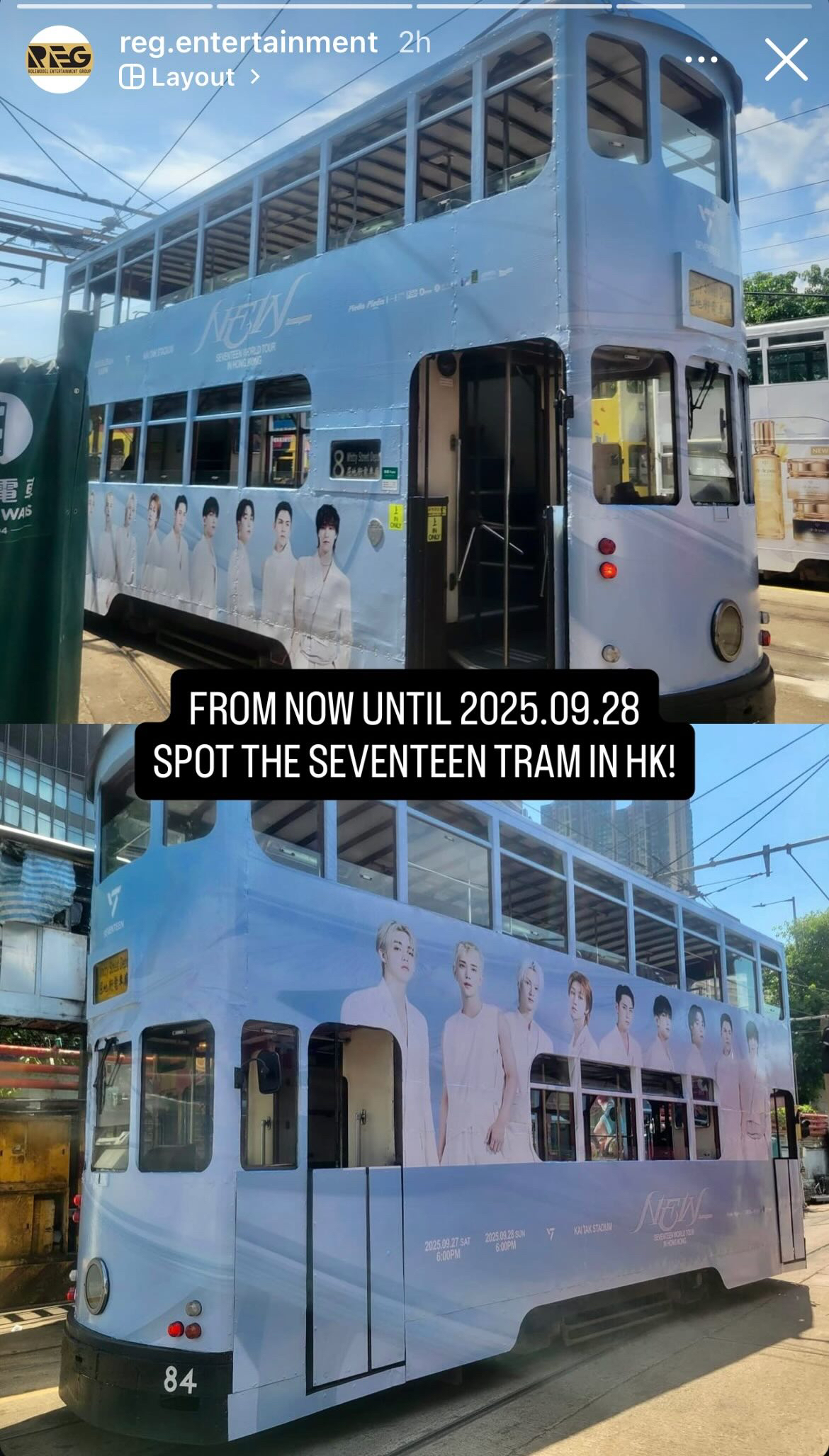 SEVENTEEN主題電車將於9月8日至28日期間穿梭港島核心區域,途經中環、金鐘、灣仔及銅鑼灣等商業區,電車時間表可參考官網公布資訊。