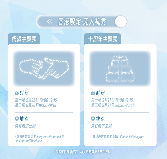為慶祝團體出道十周年,9月25日至27日在灣仔海濱公園將舉行兩大主題無人機匯演。以「相遇」為主題的演出將於25及26日晚上展開,壓軸的「十周年」主題則於27日晚上上演2場,以璀璨燈光呈現團體十年來的音樂里程碑。