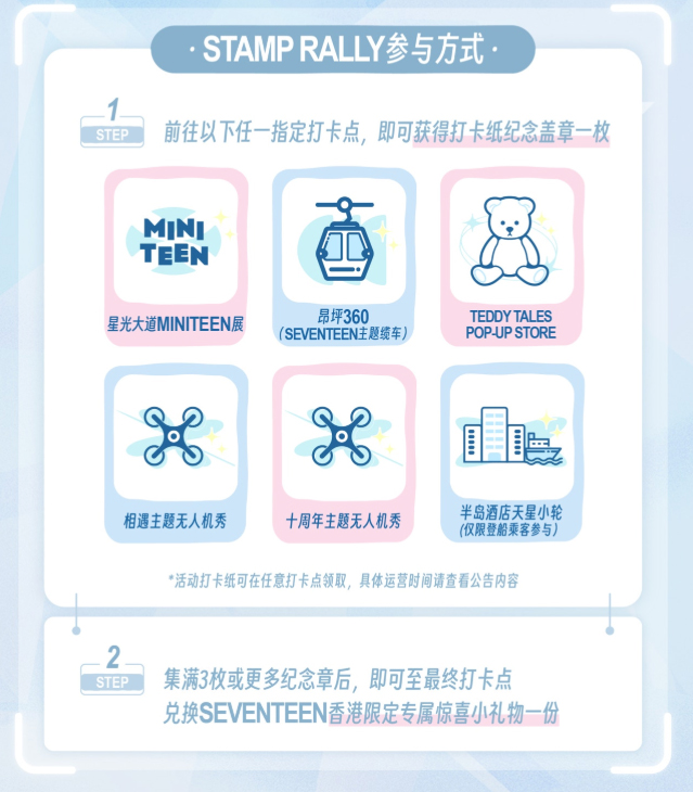 官方將「STAMP RALLY」集章活動帶到香港,由9月26日至28日期間粉絲可到六大主題打卡點,包括星光大道MINITEEN展、昂坪360纜車站、灣仔海濱公園等,收集3個或以上紀念印章並在社交平台打卡,即可換領香港限定周邊禮品!