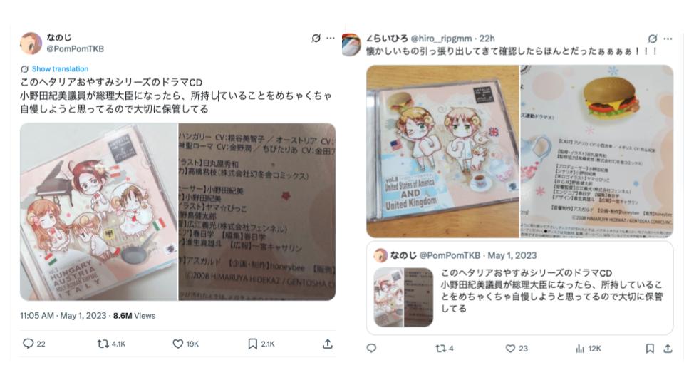 小野田紀美在就職典禮上身穿銀色連衣裙,其搶眼裝扮即引起網民熱議。據日媒報道,小野田紀美的父親是美國人,母親是日本人,1歲時移居岡山縣。她在踏入政壇前曾在SONY和Asgard等遊戲公司任職,並擔任過雜誌編輯、公關和模特兒。有日本網民隨即在社交平台分享,發現自己收藏多年的動漫作品《義呆利》(ヘタリア)的廣播劇CD上,其中製作人和編劇一欄竟印有小野田紀美的名字,證實她曾參與過動漫作品製作!消息曝光後,不少動漫迷紛紛摷出該CD「考古」,直呼對驚喜又興奮。