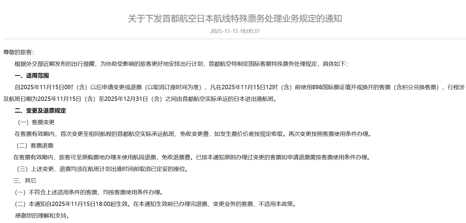 據內地民航資源網報道,至今共14間內地航空公司相繼發布日本航線機票相關通知,包括中國國航、東方航空、南方航空、四川航空、廈門航空、海南航空、春秋航空、天津航空、吉祥航空、深圳航空、山東航空、九元航空、長龍航空及首都航空。根據各航空公司公布的細則,目前免費退款及更改的適用範圍為:2025年11月15日中午12時前購買,出發日期在2025年11月15日至2025年12月31日期間的機票,往返機票皆可適用。不過,在11月15日中午12時前已辦理退票或更改的旅客不適用此規定。
