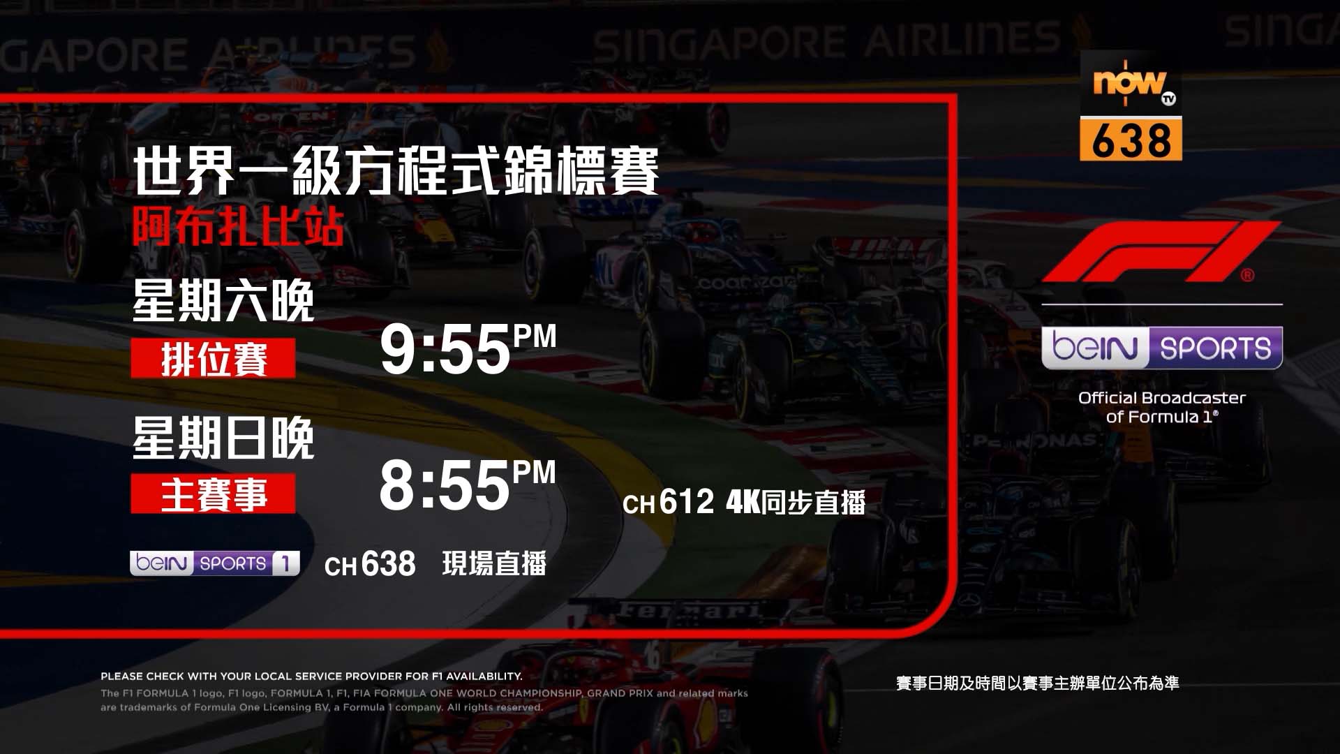 想欣賞本周日阿布扎比站主賽事,見證王者激鬥的觀眾,可於Now TV網站購買beIN SPORTS Super組合一日通行證($108/日)。購買Day pass後即可於手機、平板電腦及智能電腦登入Now TV應用程式,或以Now TV網頁版收看(最多支援兩個裝置同時睇)!