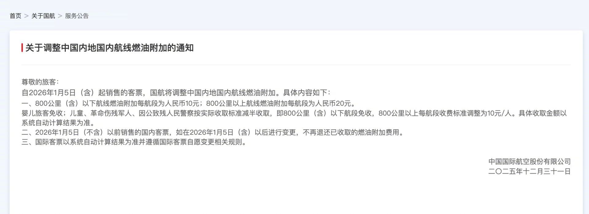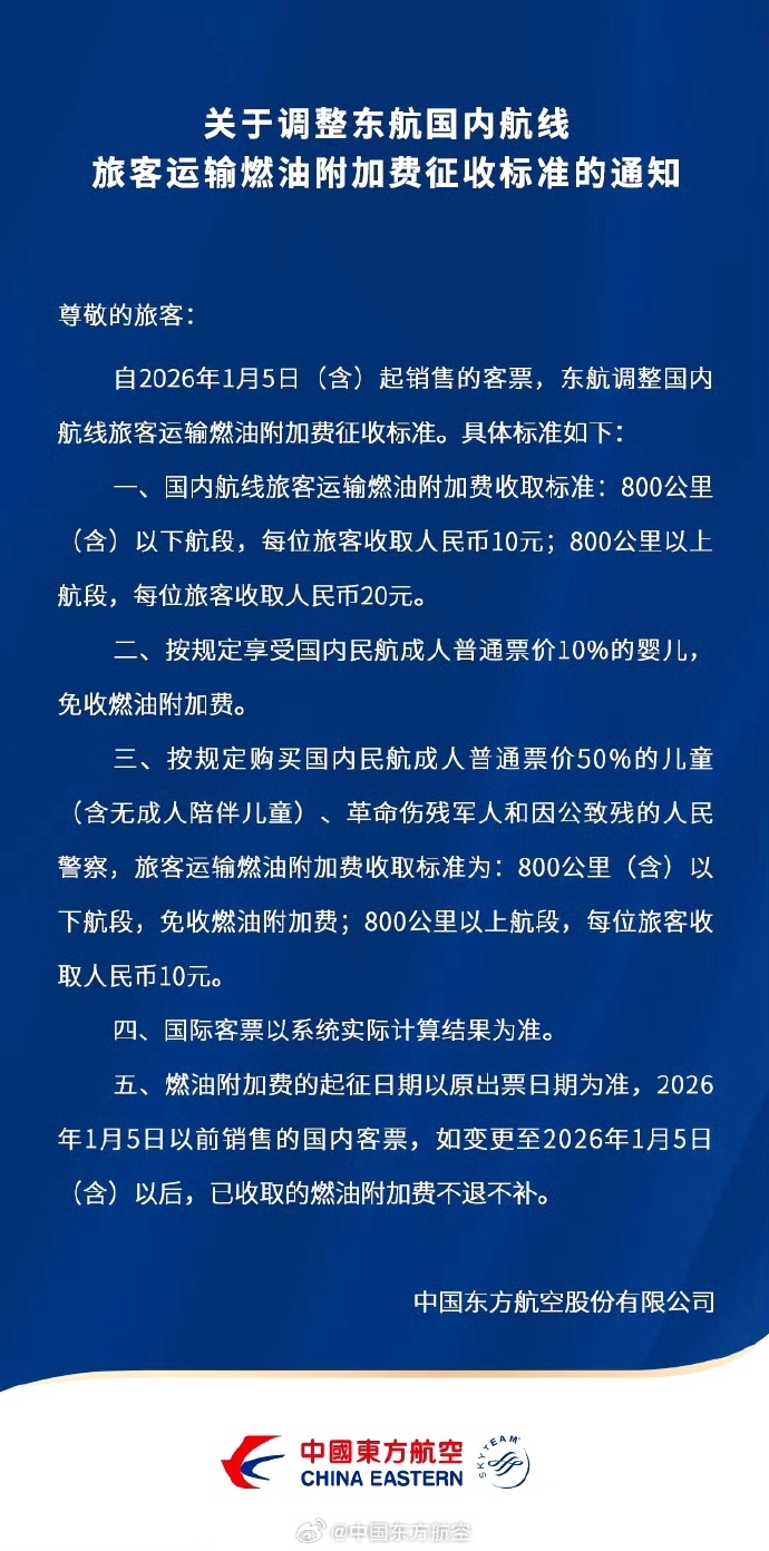 東方航空、南方航空及中國國際航空等內地主要航空公司日前宣布,於1月5日凌晨零時起正式實施新的燃油附加費標準。調整後,800公里以上航段每位成人收取20元人民幣,800公里以下僅收10元人民幣。對比之前的收費標準分別下調了10元人民幣和20元人民幣,降幅達50%。