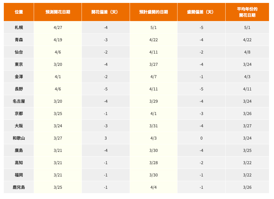 氣象協會預料,開花期將自3月20日由東京、岐阜、靜岡、名古屋等地開始,東京、名古屋雙雙預計在3月20日迎來首波櫻花,較平均早4天;隨後擴散至近畿、中國、四國及九州地區,京都、大阪等地花期僅較平均提早1至3天;北日本的開花時間則集中在4月中下旬,札幌預計4月27日開花。
