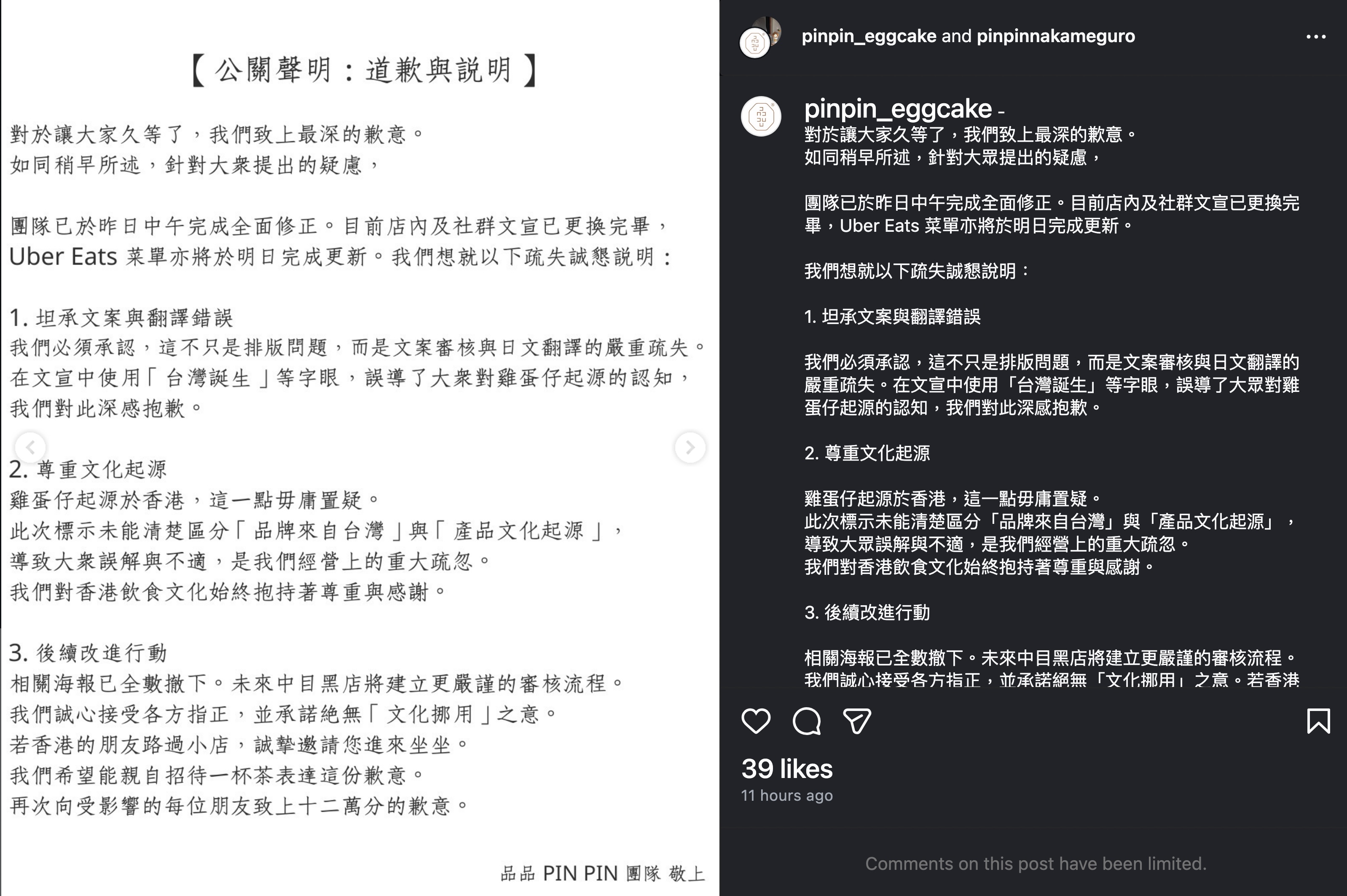 事後,店家將有關的宣傳帖文刪除,並發道歉文,指今次的事件不只是排版的問題,更是文案審核和日文翻譯出現了嚴重的疏失,誤導了大眾對雞蛋仔起源的認知。有關的誤導海報和宣傳物已經被全數撤下,社交媒體帳號上有關雞蛋仔的描述也加入了「雞蛋仔來自香港」的字眼。