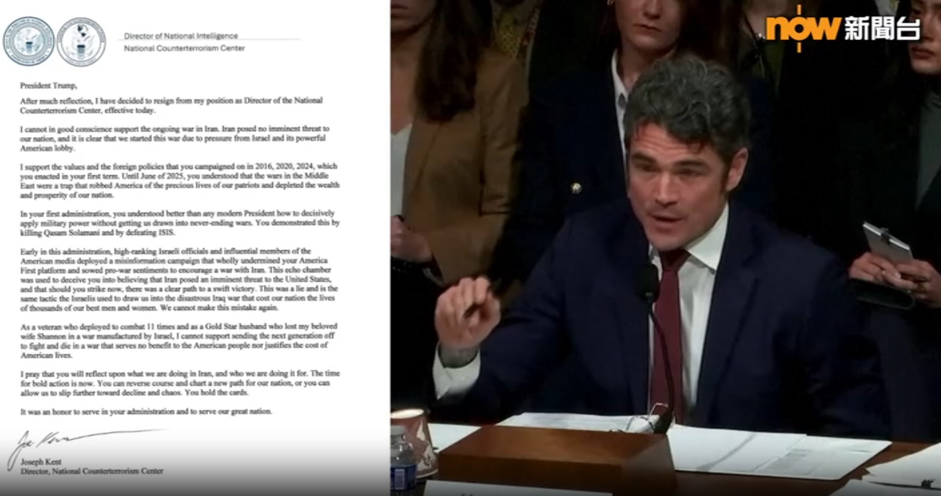 【Now新聞台】美國國家反恐中心主任肯特宣布辭職,說自己無法昧著良心支持對伊朗的戰爭。美國總統特朗普形容肯特在安全問題上很軟弱,說他離職是好事。