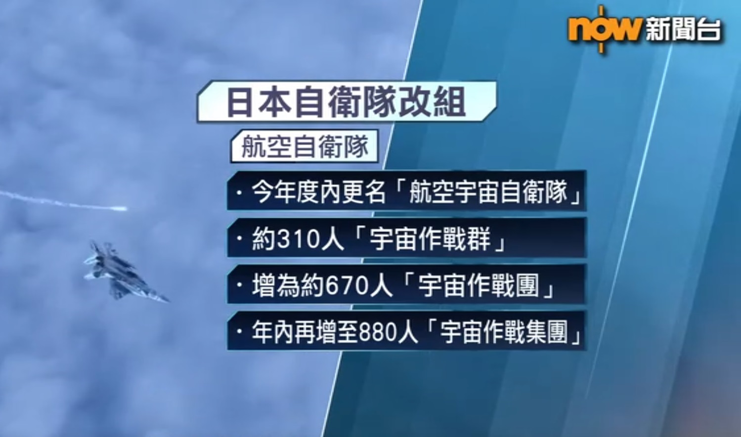 【Now新聞台】日本自衛隊今日大規模改組,包括增設水上艦隊及新設水陸兩棲機雷戰群,以加強島嶼防禦,亦會擴大宇宙作戰隊,年內將航空自衛隊改為航空宇宙自衛隊。