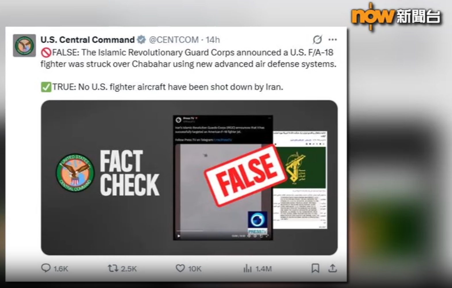 伊朗又聲稱自上月底開戰至今,伊朗已合共擊中或擊落202架美國和以色列的軍機。美軍中央司令部隨後在社交平台發文,反駁稱伊朗說法失實,重申至今沒有一架美國軍機遭到伊朗擊落。