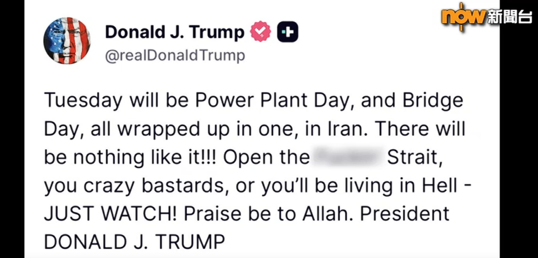 美國總統特朗普近日連番威脅伊朗,聲稱伊朗若在美國東部時間周二晚上8時、即本港時間周三早上8時,仍未重開霍爾木茲海峽,就會重點攻擊對方的能源設施及橋樑,更揚言屆時伊朗將會變成地獄。