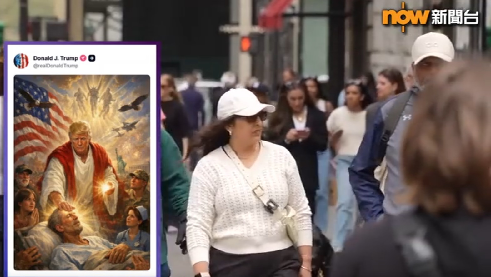 特朗普星期日晚,在社交媒體張貼一張AI人工生成圖片,當中見到特朗普身穿飄逸長袍,觸摸一名病人的頭,手及頭都散發光芒,眾人都仰望著特朗普,令人聯想到好像耶穌拯救世人。