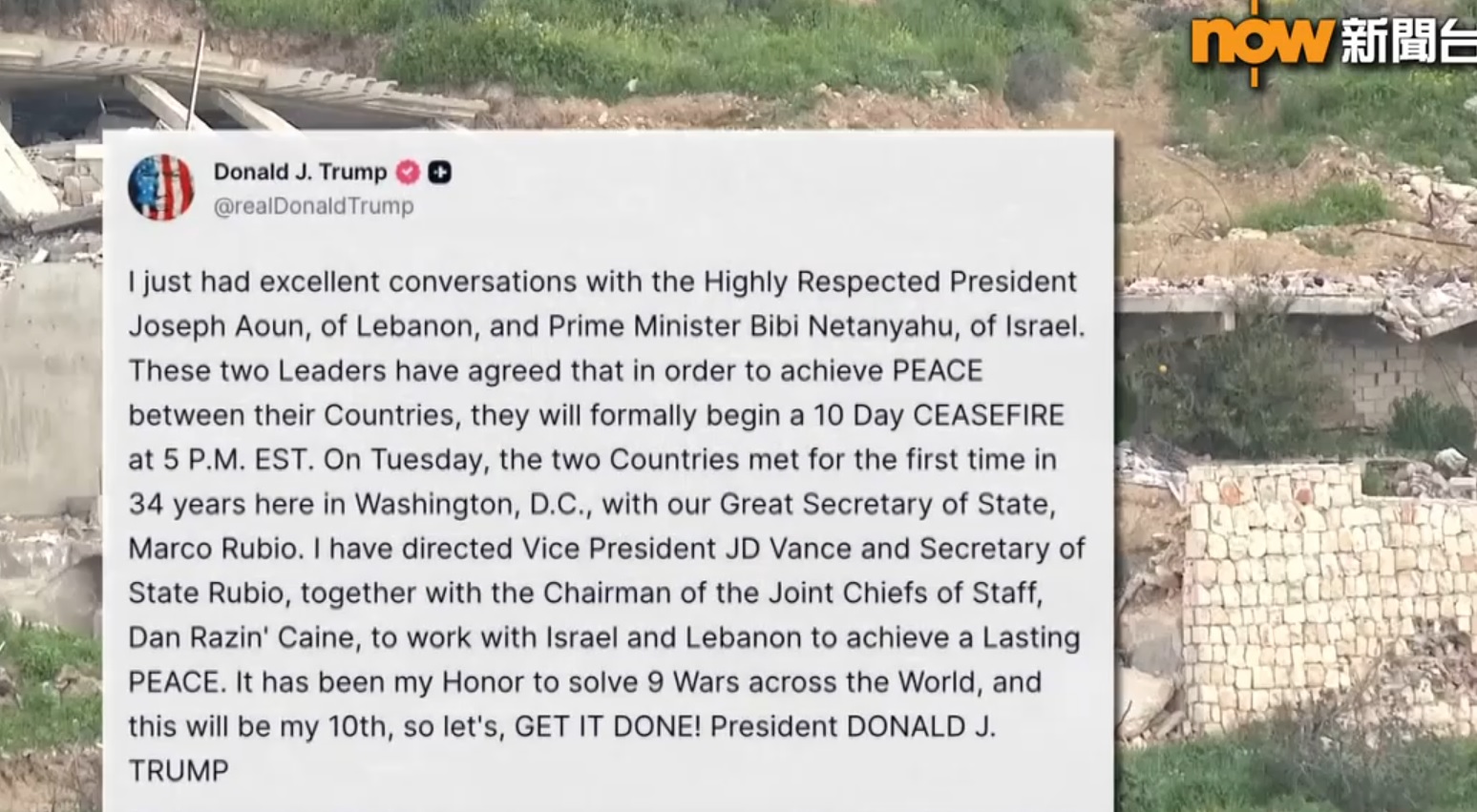 美國總統特朗普較早時在社交平台公布以色列和黎巴嫩達成10天臨時停火消息,並指示副總統萬斯、國務卿魯比奧及美軍參謀長聯席會議主席凱恩,與以黎兩方合作實現兩國持久和平。