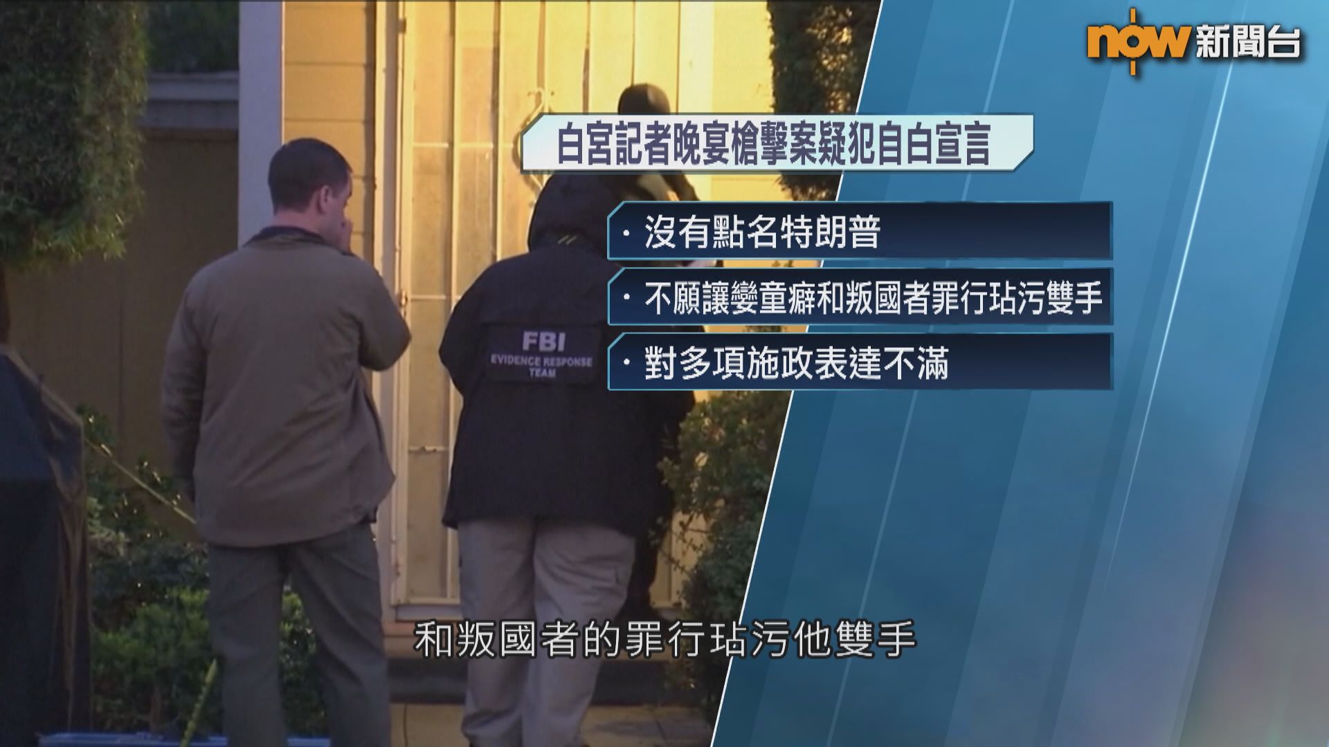 【Now新聞台】美國白宮記者晚宴槍擊案,據報疑犯施襲前不久向家人發自白宣言,當中宣稱不願讓強姦犯玷污雙手。總統特朗普受訪時否認疑犯所聲稱的與他有關。據報白宮將與多個部門開會,檢視總統保安安排。