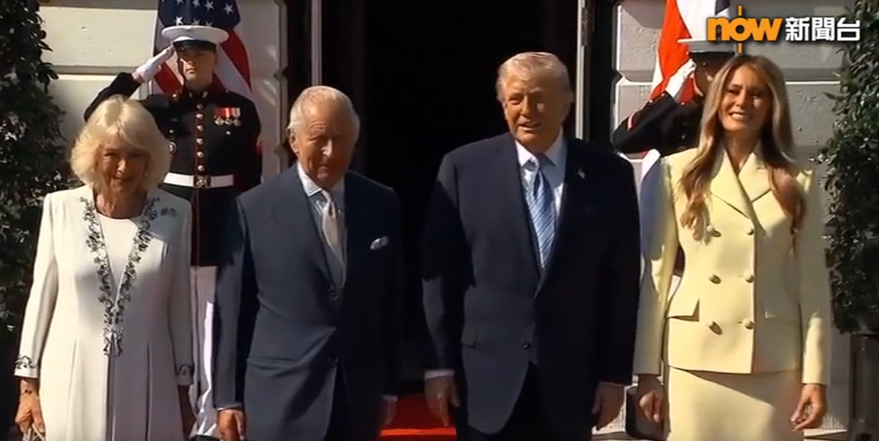 查理斯夫婦其後前往白宮,美國總統特朗普及夫人梅拉尼婭親自在門口迎接。特朗普和查理斯握手近十秒,力道十足,似乎較勁一番,四人之後舉行茶敘。