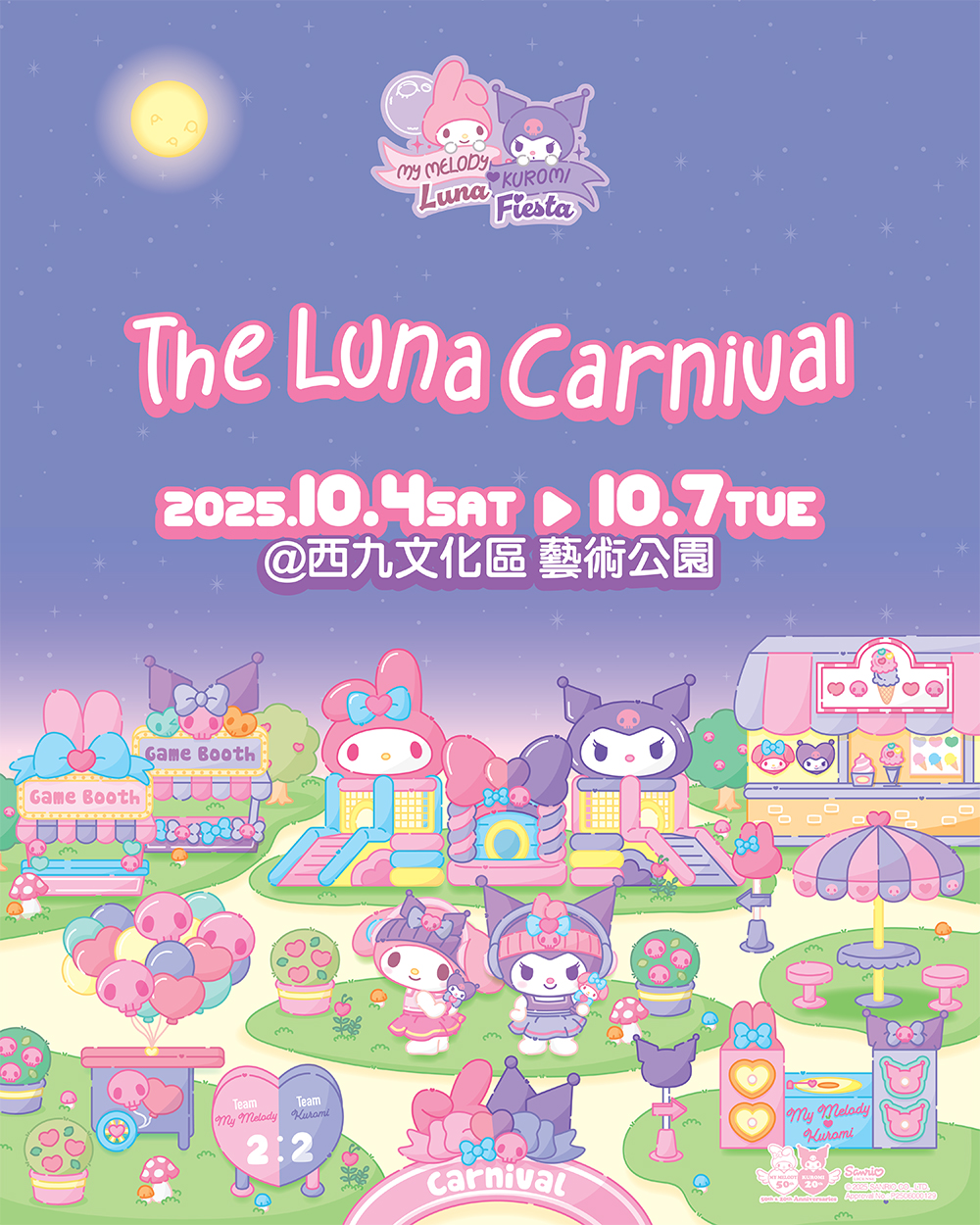 為慶祝Sanrio兩大人氣角色My Melody誕生50周年與Kuromi誕生20周年,西九文化區海濱草坪將於10月4至7日舉行「My Melody x Kuromi Luna Fiesta」周年慶典活動,帶來三大重點活動包括主題跑「Sweet Rivalry Battle Run」、嘉年華「The Luna Carnival」、野餐派對My Melody x Kuromi Luna Fiesta – Bestie Picnic。其中佔地超過10萬平方呎的「The Luna Carnival」,將打造成主題遊樂園,設多款以兩位角色造型設計的遊戲攤位與打卡裝置。而野餐派對「Bestie Picnic」設3米高巨型My Melody與Kuromi打卡裝置、主題美食攤位,10月4日更有兩大主角及「星級萌友」Anson Lo及Jeremy現身見面會!鏡粉們不要錯過!