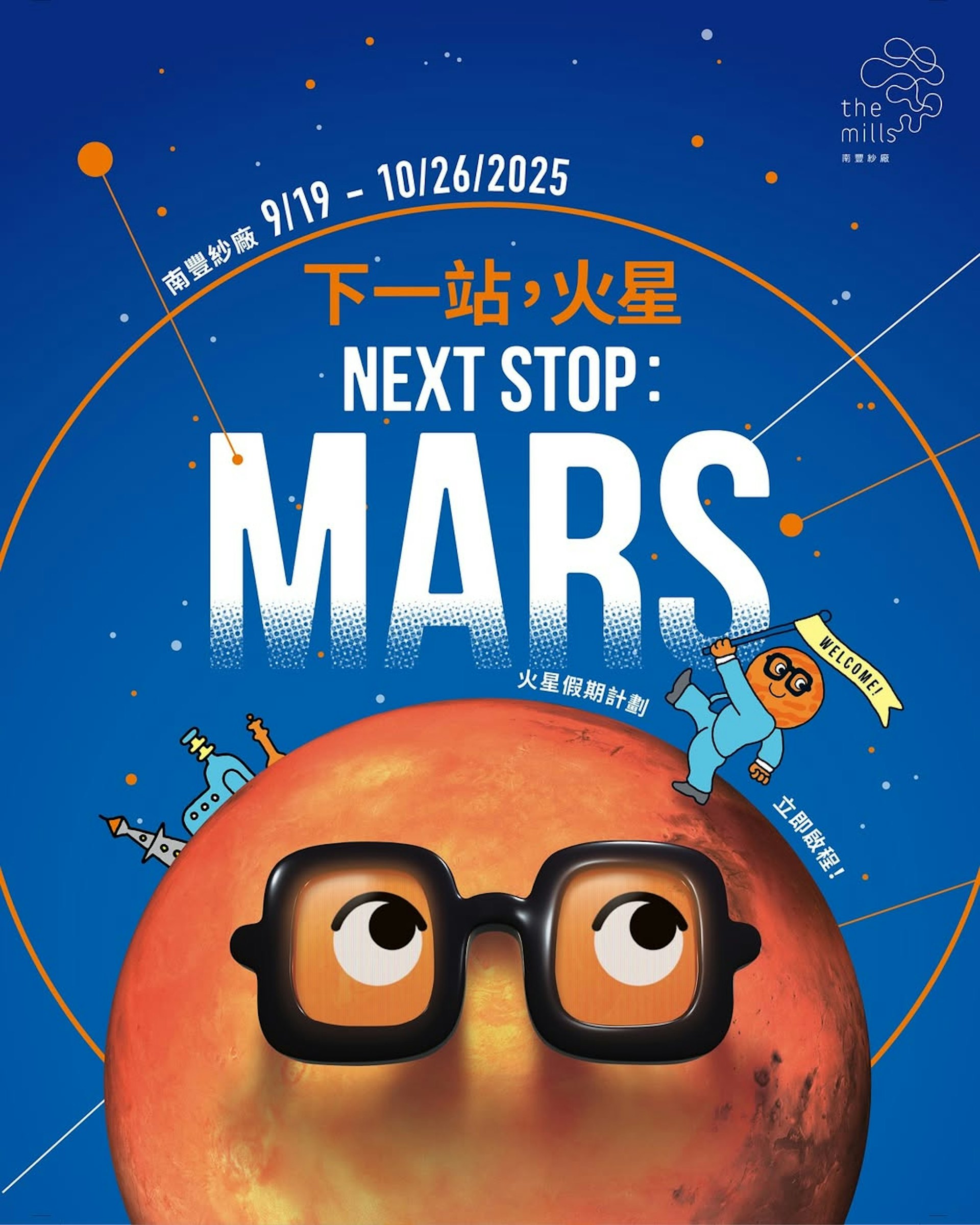 南豐紗廠於9月19日起,舉辦《下一站:火星》假期計劃主題展覽,旨在讓參觀者走出地球,來一場超越月亮,結合科幻想像與科普知識的火星之旅。市集設有6米巨型發光火星裝置,大會參考了NASA資料與航拍影像按比例製作而成,懸掛於紗廠坊,近距離感受火星的景色。還有一系列身心靈工作坊,探索氣場、脈輪、馬雅曆法等,更有一系列「火星手信」商品等。