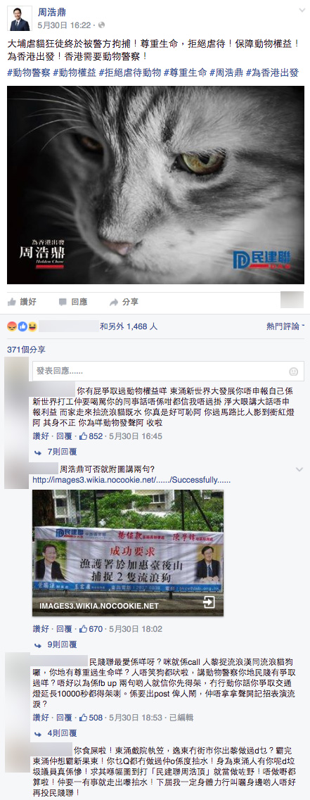 民建聯的周浩鼎急不及待出post:「大埔虐貓狂徒終於被警方拘捕!尊重生命,拒絕虐待!保障動物權益!為香港出發!香港需要動物警察!」
