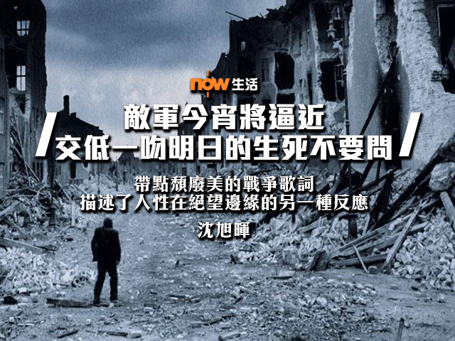 這種帶點頹廢美的戰爭歌詞,和我們聽慣那種「社運雄性抗爭反戰歌曲」完全不同,沒有鼓動爭取公義、或唱高調作太多道德批判,卻描述了人性在絕望邊緣的另一種反應,又教人想起《鐵達尼號》沉沒前,有些豪客依然要香檳跳最後一舞的貴族式浪漫。從中,我們更能體會人性的多元複雜,原來就不是任何教科書的套版形象所能概述。