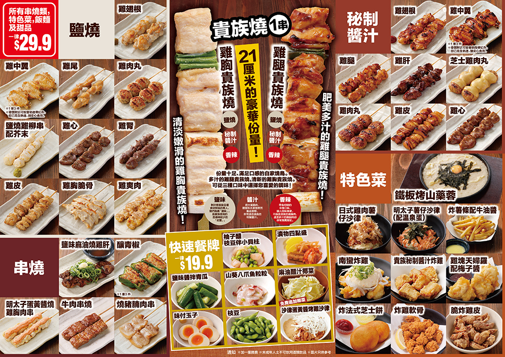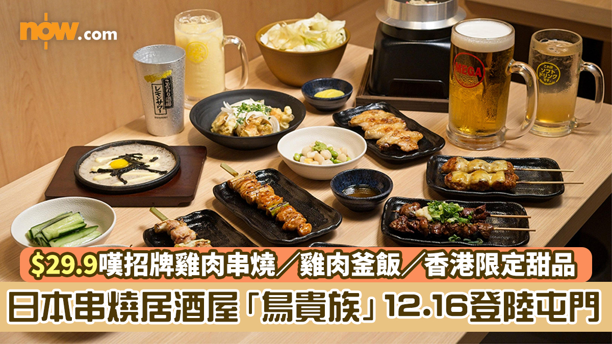 主打平價雞肉串燒和雞肉料理的「鳥貴族」,香港分店將於12月16日正式開幕,選址屯門市廣場1期,佔地2,000平方尺,提供近百個座位。香港店的餐單與日本本店的餐單基本相同,包括招牌的「雞腿貴族燒」、「鹽燒雞翼串」、「貴族雞釜飯」等。所有串燒、特色菜、酒精飲料、飯麵及甜品統一定價 $29.9。除「雞腿貴族燒」及「雞胸貴族燒」每碟一串外,其餘串燒均為每客兩串,大家小心叫多咗!