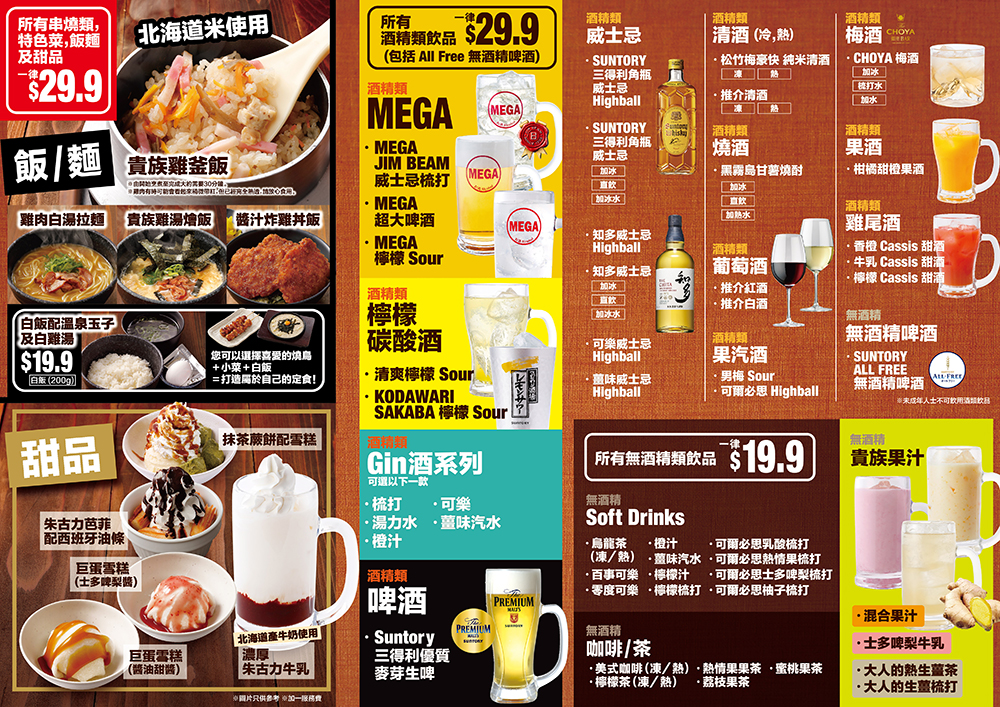 至於無酒精飲料及小菜,包括香港限定的柚子醋枝豆拌小貝柱、檸檬茶等,則均一價$19.9。為慶祝香港首間分店開幕,開業期間每枱顧客將會獲得鳥貴族限量版貼紙一張,數量有限,送完即止。