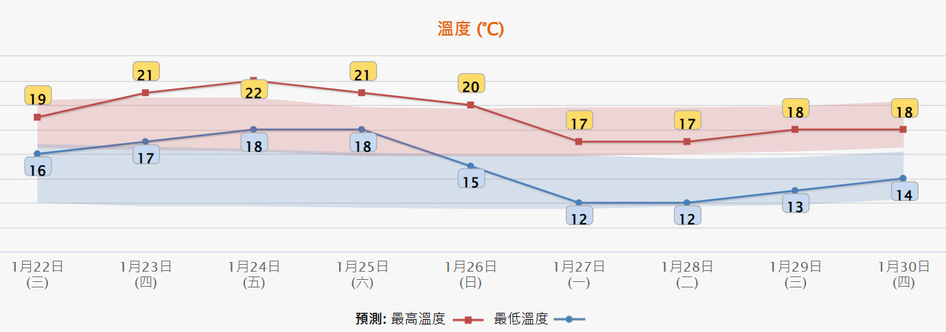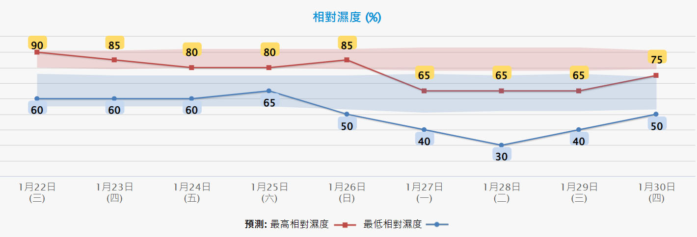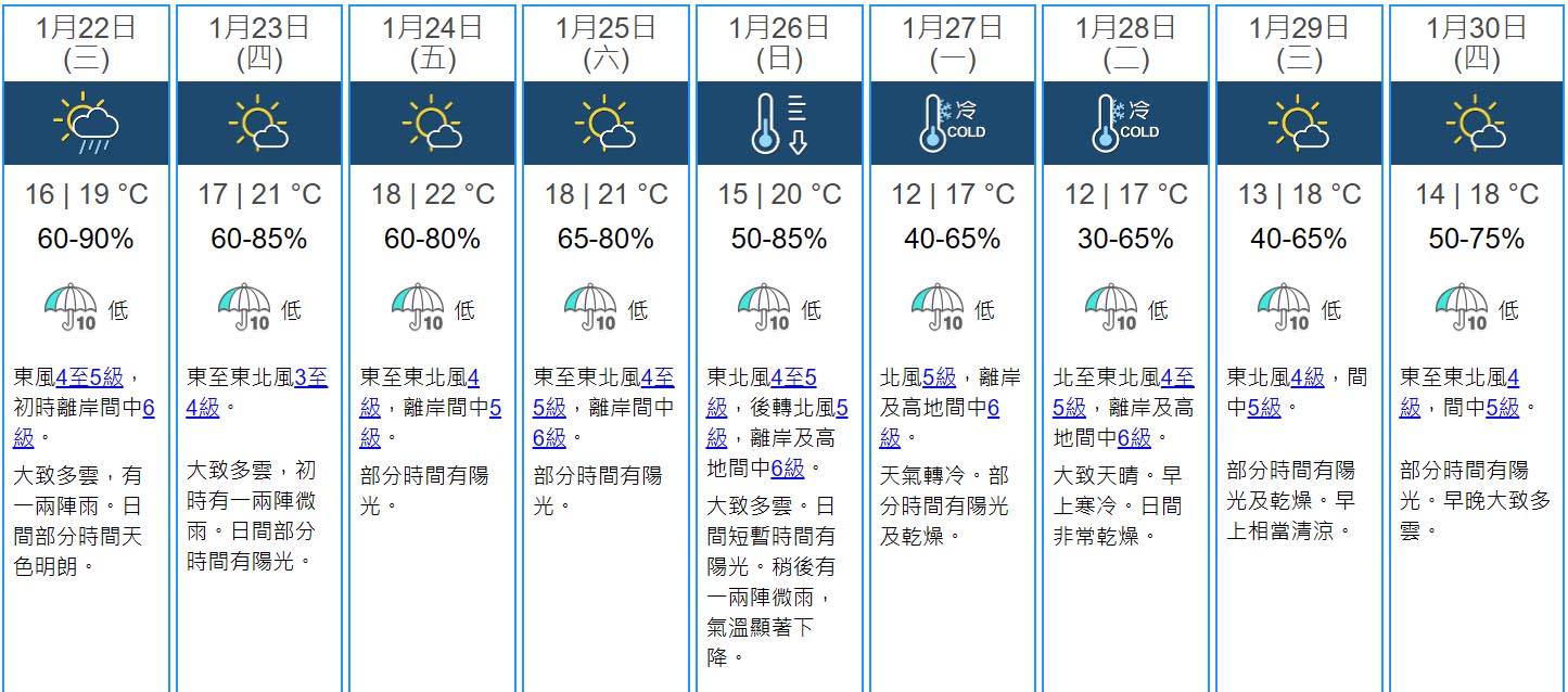 從天文台未來九日天氣預測顯示,下周一最低氣溫12度,下周二濕度介乎百分之30至65,至於年初一至年初二早晚氣溫仍然較低,預計只有13、14度。大家穿多點衣服,過年更有氣氛。