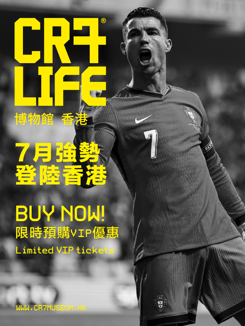【Now.com】足球巨星C朗拿度(Cristiano Ronaldo)今日(5日)迎來40歲生日。而展出其職業生涯故事的「CR7®生活博物館」將於7月登陸香港,是亞洲首個C朗博物館!展覽選址尖沙咀K11 MUSEA,為期1年,將展出C朗拿度職業生涯的冠軍獎盃、球鞋、部份親筆簽名紀念品等。3種VIP套票將於今晚7時發售,套票最貴4000元,即睇售票詳情及福利!