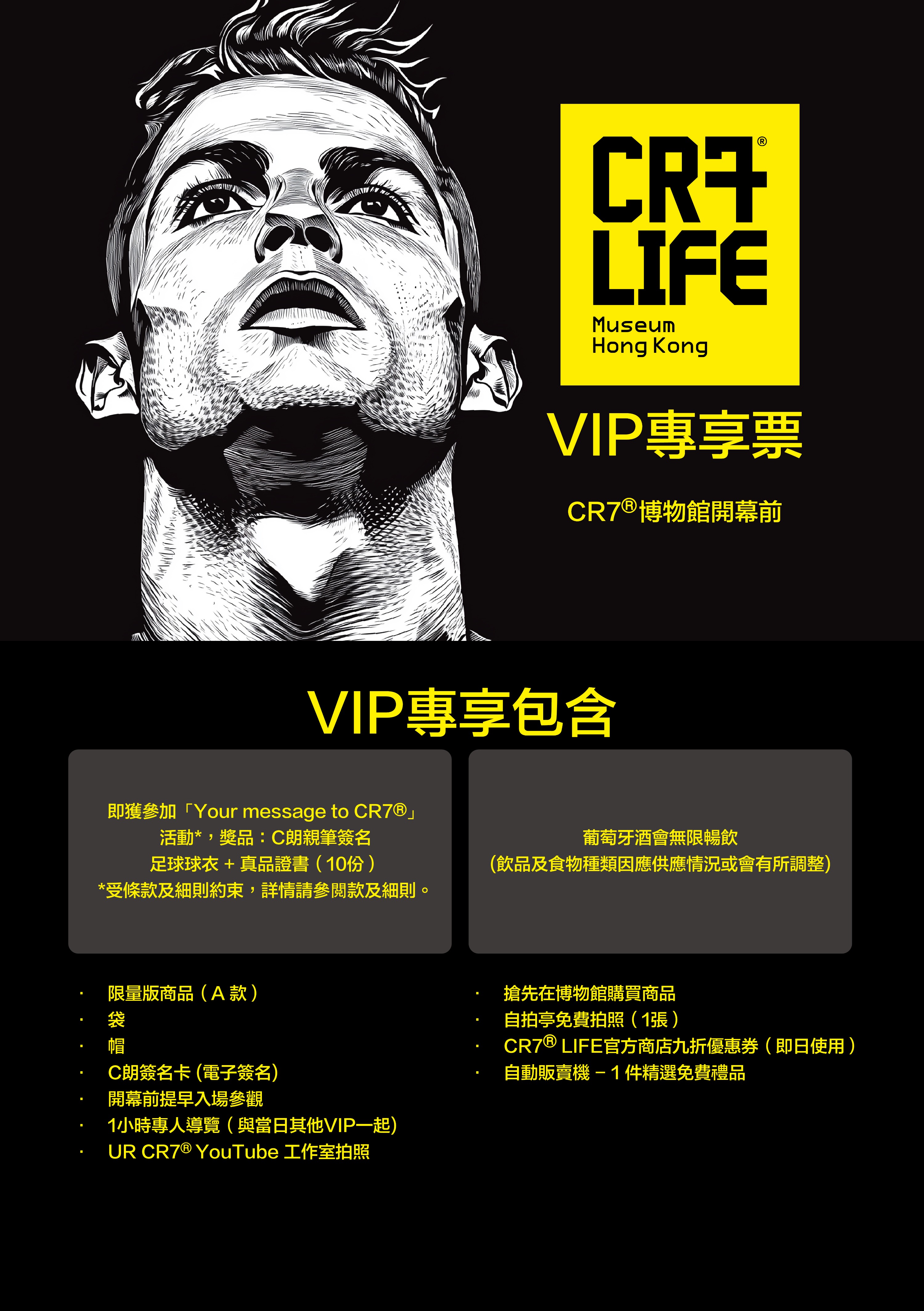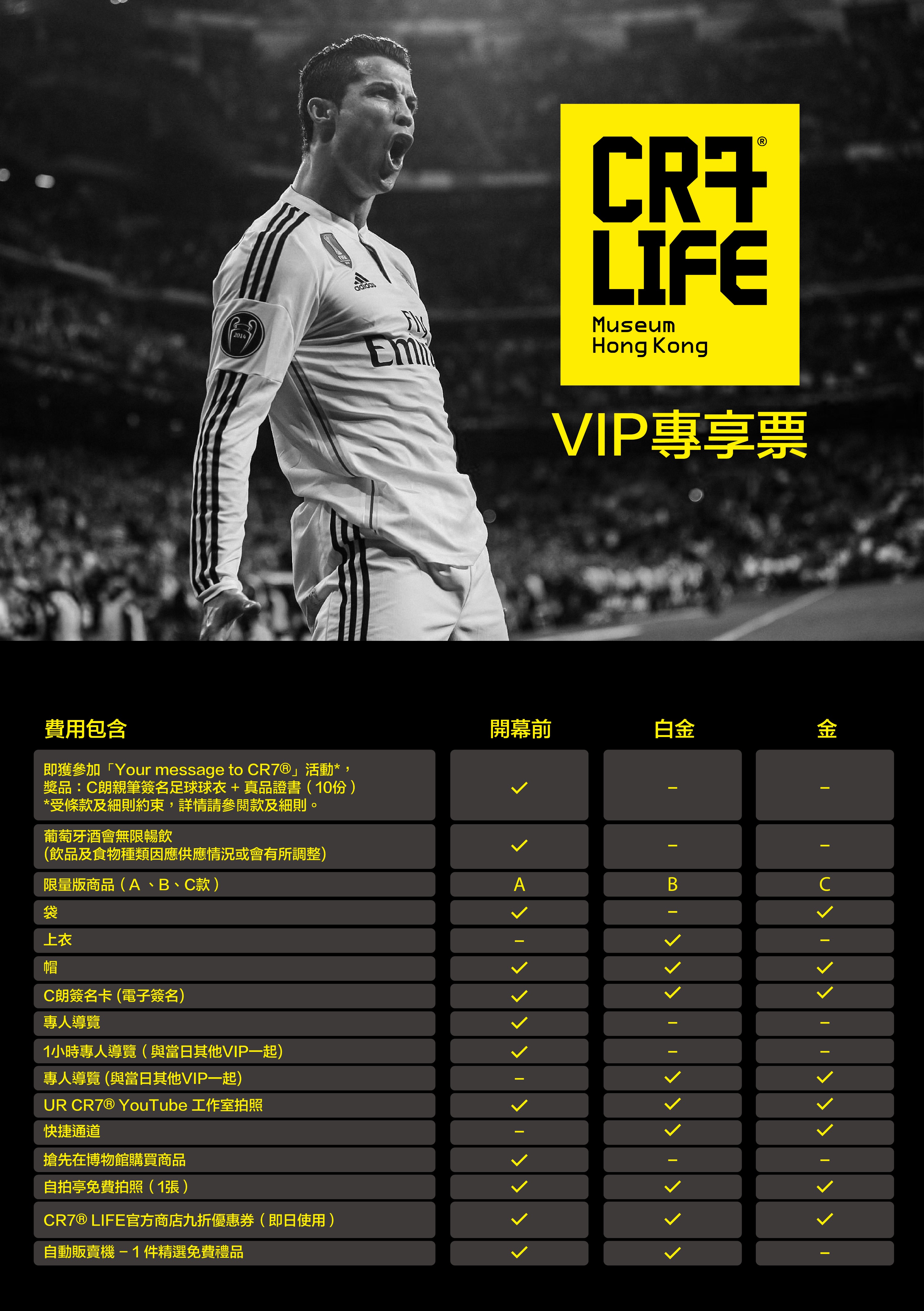 專屬福利:限量版商品、袋、帽、C朗簽名卡 (電子簽名)、專人導覽(與當日其他VIP一起)、UR CR7 Youtube 工作室拍照、快捷通道、自拍亭免費拍照(1張)、CR7® LIFE官方商店九折優惠券(即日使用)、自動販賣機1件精選免費禮品 - 白金VIP套票