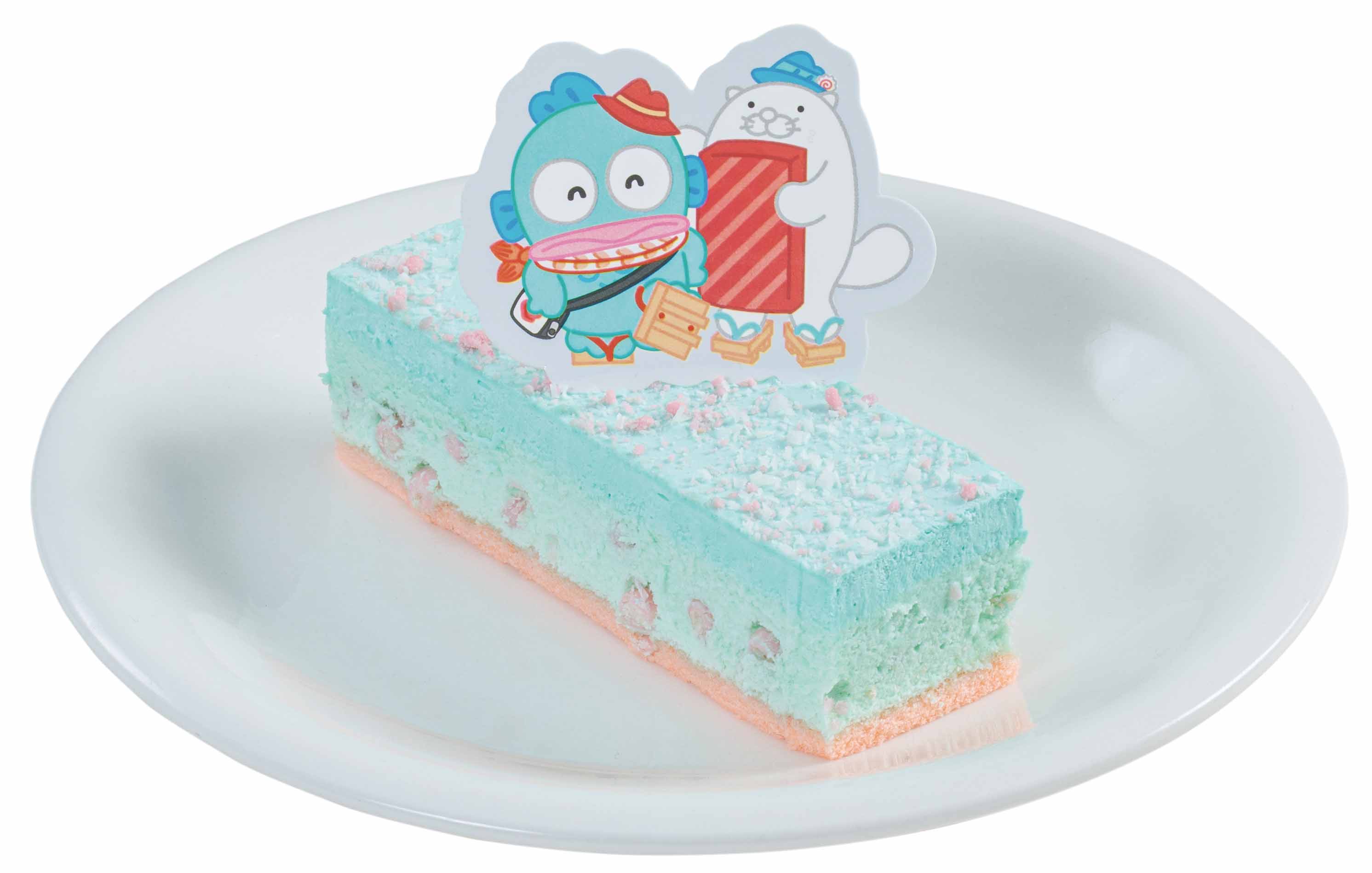 水藍色薄荷味雪糕蛋糕有粉紅色脆粒,呼應HANGYODON嘴唇的顏色,而家為蛋糕添加口感。