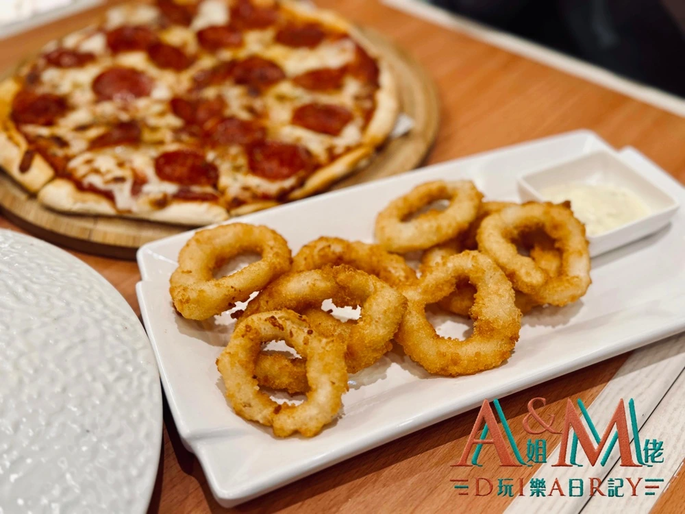 即叫即炸嘅魷魚圈,炸到金黃色,外層薄而酥脆,內裡彈牙軟嫩,沾上他他醬更惹味。