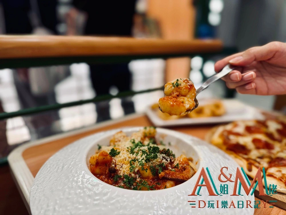 手工意粉可揀意粉、扁意粉、寛扁意粉、孖辮意粉、捲捲麵、薯仔麵團。其中薯仔麵團呈橢圓形嘅外形,軟綿綿嘅質感;醬汁以濃稠嘅肉醬與滿瀉嘅蕃茄味為主,加上香草嘅加持,味道酸中帶甜,而麵團充分吸收晒醬汁嘅味道同肉汁,非常惹味。