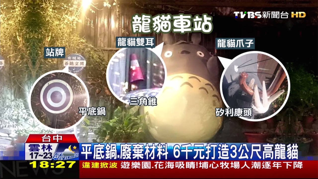設計師林孝勇用了兩個月時間、花了不到六千元就打造了一個三公尺高的龍貓出來。龍貓胖胖的身軀是用平板鋼材一塊塊打造再噴油而成的,再配上「雪糕筒」製的耳朵、玻璃膠咀製成的龍貓爪,可愛龍貓大功告成!旁邊還有用平底鍋製成的車站牌。換言之,整個場景完全是利用裝修的廢棄材料而製成的,十分環保!