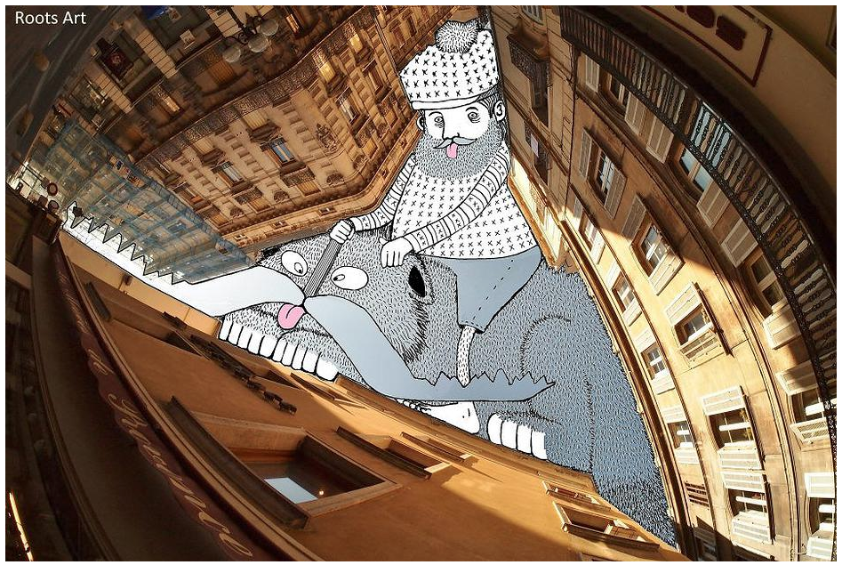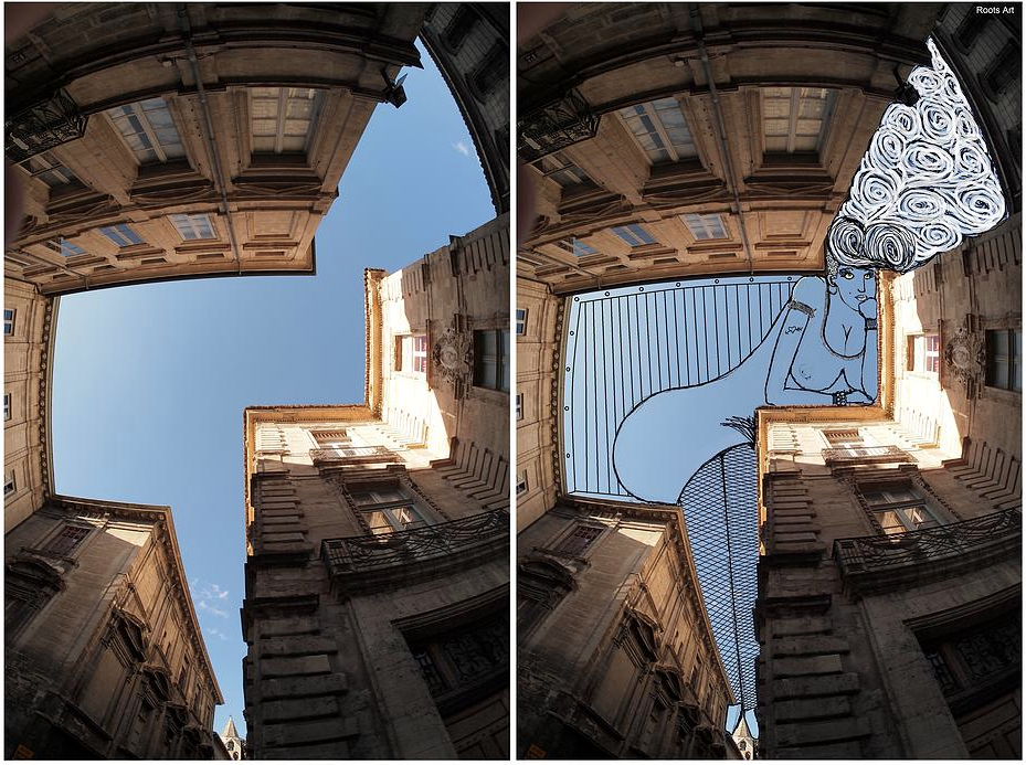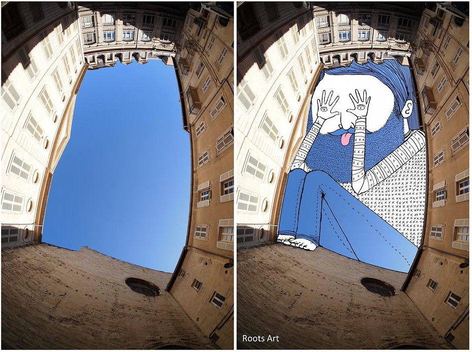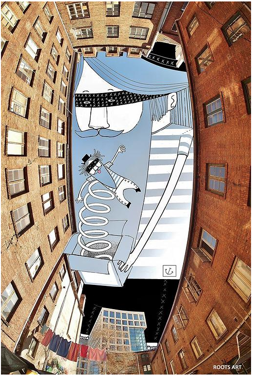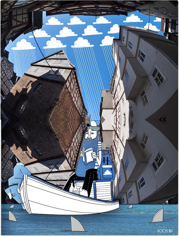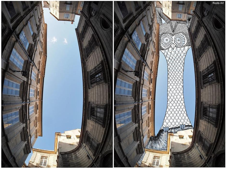 據英國《每日郵報》報道,Thomas使用魚眼相機向天空拍出垂直照片,然後再用繪圖軟件Microsoft Paint在建築物之間添加不同插圖,而這些抽象的插圖是描述各種不同幽默人物和超現實場景。Thomas表示他的藝術創作目的是希望人們多留意周圍日常環境,啟發無盡的想像力。