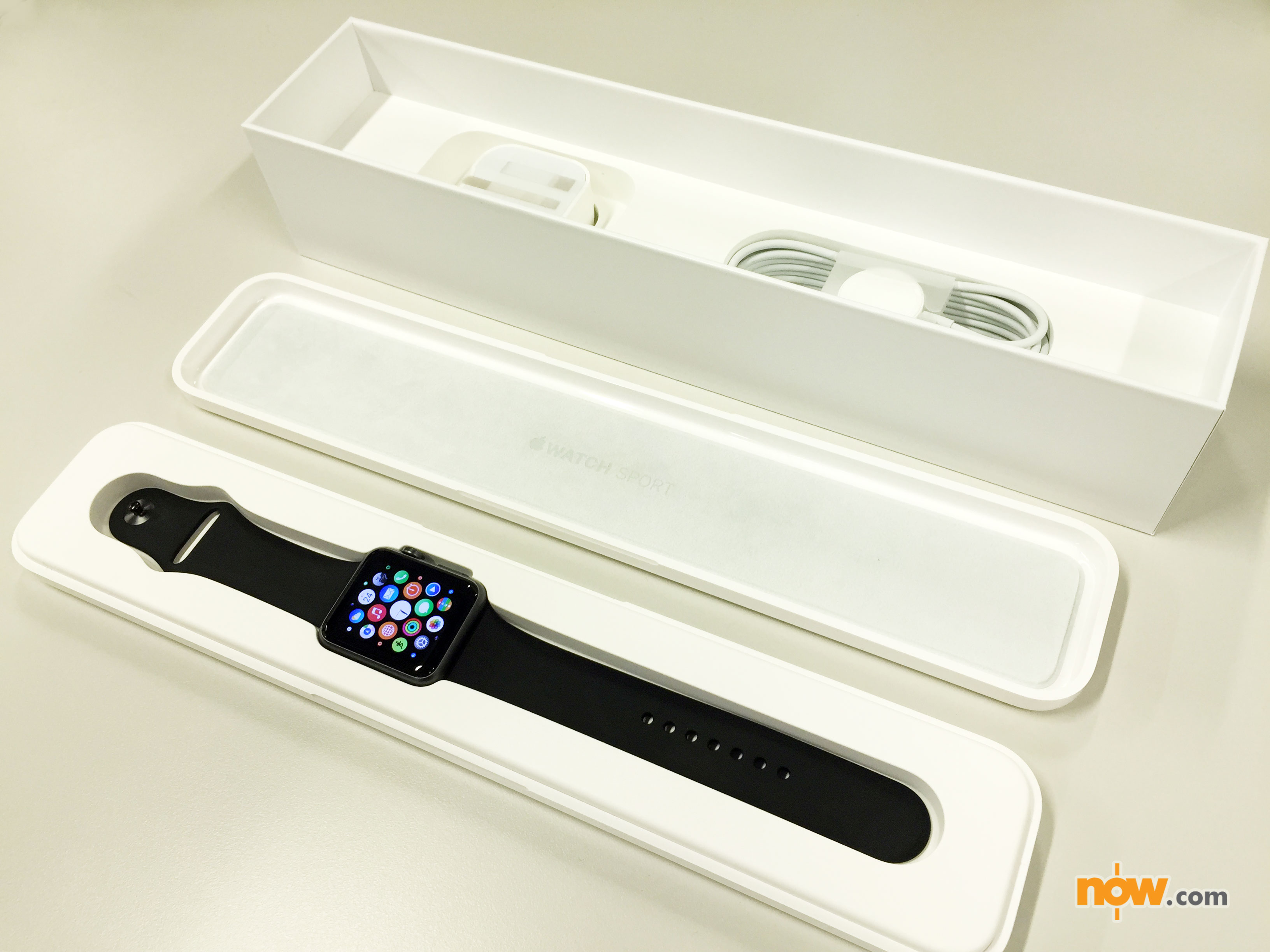 今次這款平價版Apple Watch Sport包裝盒非常巨大,白色膠盒更被編輯部同事戲稱為加大碼筷子盒,觀感上略為失色,不過接下來編輯部會繼續發掘這枚話題gadget的功能和用後感,請繼續留意now.com報道。