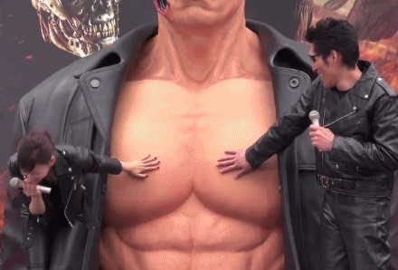 據日本傳媒報道,巨型人像高3米,右眼會放出紅色閃光,當揭幕的時候,人像更大叫經典金句「I will be back(我會回來)」。而另一個特別之處就是阿諾會震動的胸肌,有份主持揭幕禮的女星西內瑪利亞和奧運柔道選手篠原信更手多多,將手放到阿諾人像的胸肌上,立刻令西內瑪利亞掩嘴大笑。