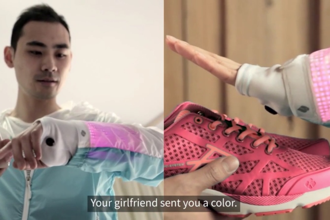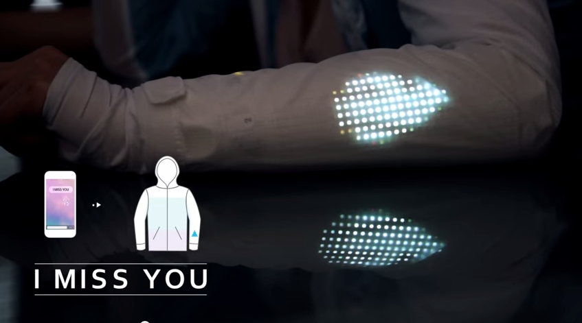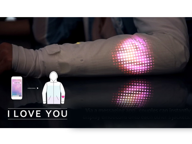 品牌最近在YouTube放出展示這件情侶外套的影片,又邀請了一對異地戀的情侶實試。穿上這件外套之後,再連接專屬應用程式後,再在聊天室發送訊息,對方的手袖位就會出現顏色符號,例如發送「我愛你」,就會出現紅色心心圖案;如果是「我想你」,就會有一連串眼淚等等不同圖案。而且手袖下方又有一個可以讀取顏色的鏡頭,當你拿著不同顏色的物件時,對方外套的袖子就會顯示不同顏色,另一半就能感受到你在附近一樣。