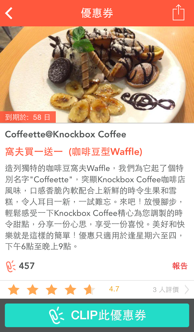 用家可以利用《Clipper》,尋找飲食、美容保健、時尚、家居、玩樂和生活品味6大範疇的優惠,例如飲食類就有好多買一送一、現金卷或免費試食的coupon,慳埋慳埋都幾著數!而且採用二維碼掃瞄功能(QR code),無需列印Coupon,只要到店舖用App一掃就可以享有優惠內容,一部手機遊天下!