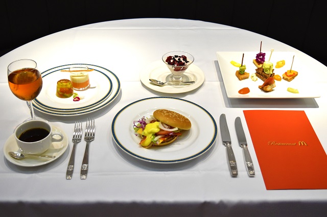 據日本傳媒報道,這間高級麥當勞主打精緻的高級料理,所有食物會以餐盤盛載,客人又會以刀叉食用,十足十西餐fine dining。「Full Course 料理」更有5道菜,前菜是由薯條製成的Vichyssoise法式馬鈴薯凍湯和以蔬菜製成的果凍;開胃菜則是蔬菜雞肉煎餅、雞柳、魚柳、蝦餅和漢堡;主菜是更可由客人三選一漢堡;甜品就有OREO麥旋風和咖啡。