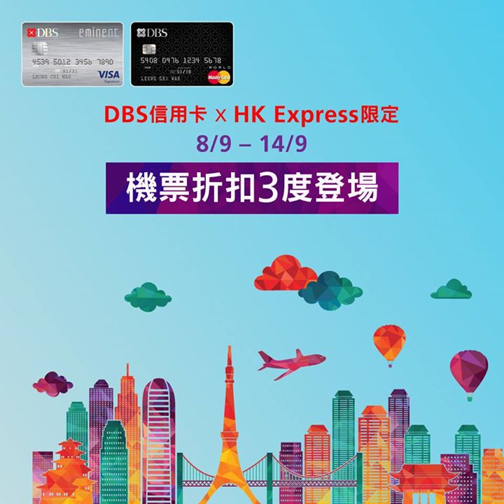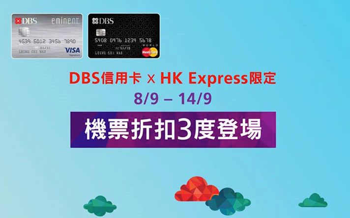 由今日起至9月14日,預訂由2015年9月8日至2016年7月14日期間出發的機票,用DBS Eminent Card付款和輸入優惠碼即享機票8折優惠,DBS Black World MasterCard就有票價85折優惠。