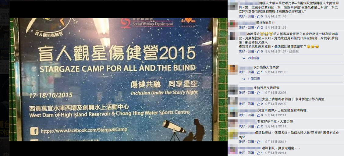 為期兩日一夜的「盲人觀星傷健營2015」將於下月假西貢萬宜水庫及西壩及創興水上活動中心舉行,活動希望透過觀星、觀日出等活動,凝聚傷殘及健全人士一同感受星空及大自然的美妙,推廣傷健共融。活動已經舉辦了5年,其實並非新鮮事,不過今年就因一張燈箱海報被放上社交網站而引起廣泛關注,更有人指「盲人觀星」帶有貶義,活動籌委會主席黃錦沛就否認有揶揄成份,他說:「其實呢個名稱就係一位失明朋友建議我哋咁用,佢哋覺得『盲人並不盲』,最緊要心水要清,心唔係盲嘅。」黃錦沛又分享他一次幾乎墮崖的親身經歷:「過往我哋搞過『盲人觀日出』活動,活動之後我帶失明朋友落山時,我就見到左邊有懸崖,之後就提示失明朋友,不過失明朋友話『我聽到』,但係我就算合埋眼都聽唔到。」他指這次經歷令他明白到自己不應該自以為是。