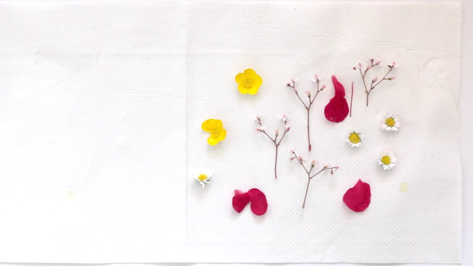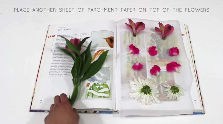 先找一本比較重的書,如字典、電話簿等。打開內頁,放入廚房紙/牛油紙,再放上剪下來的鮮花。最後放多一張廚房紙/牛油紙於花上,合上書本。把書本放到陰涼地方,上面再放多幾本書壓實。此方法比自然風乾法省位,但容易把鮮花壓到變型。