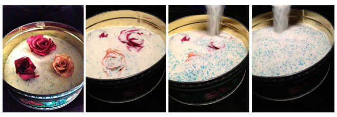 先準備大量乾燥劑(零食、鞋盒內細細包那些),如不確定乾燥劑能否使用,可放入焗爐,以200度焗約一小時,讓它變回乾身。在有蓋密實盒內鋪滿一層乾燥劑,放入鮮花後再鋪上一層乾燥劑,完全遮蓋鮮花後即可閂蓋密封。見到乾燥劑變色就代表完成,花上有殘留的粉末可以以掃輕輕抹走。