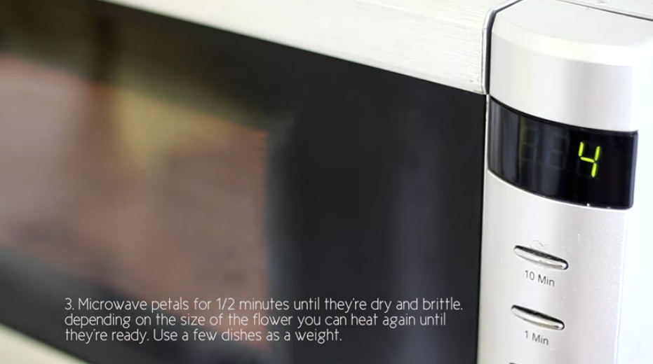 居家必備微波爐其實都係製作乾花的好幫手,不過礙於體積關係,不宜整束花放入去叮。襯花剪去花莖即可使用,大的花就建議只用花瓣。把花或葉子用紙包好,放入微波爐叮數十秒至一分鐘即可。